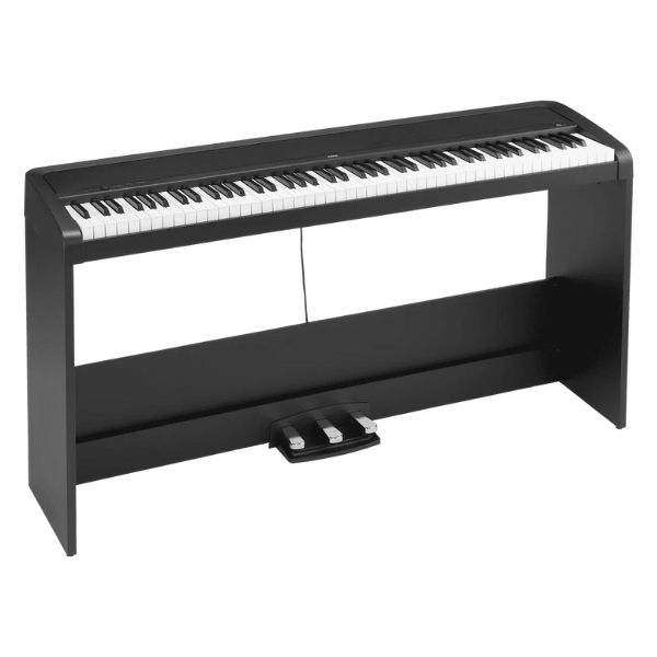 Start your piano journey with the Korg B2SP-BK digital piano, the complete package featuring 88-key Natural Weighted Hammer Action keyboard for authentic acoustic piano feel. Experience Korg’s new piano sound engine with 12 carefully selected sounds including legendary German and Italian concert grands, electric pianos, organs, and strings. This beginner-friendly piano includes furniture-style matching stand, three-pedal unit with half-damper support, powerful 30W stereo speakers, and 120-voice polyphony. Perfect for students and home practice with USB MIDI/Audio connectivity, generous software bundle (Skoove lessons, Korg Module Le, Gadget 2 Le), adjustable touch control, built-in metronome, reverb and chorus effects, and spacious music rest. Ideal for beginners seeking quality sound and realistic feel in an affordable, elegant package.